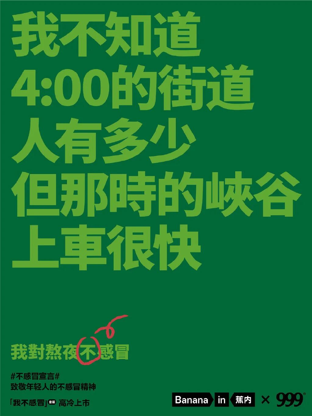 下班打卡铃响起,一名年轻人转身离去,步伐中满是「对金钱不感冒」的果决。第三幕,校园操场上,鲜花、蜡烛和吉他就位,一场浪漫的告白正在上演。没曾想,女主角带着灭火器现身,宣泄「对爱情不感冒」的怒气。三个小故事的结局,如爽剧般的剧情反转,超乎观众的想象,让人看得欲罢不能。畅快解气过后,又能启发观众对现实生活的深思。「感冒」一词,原是指一种流行疾病,经过网络流行用语的改造,「感冒」延伸为对某种事情或人不感兴趣、不喜欢的表现。999感冒灵x蕉内用巧妙的一语双关,讽刺批判当下年轻人「不感冒」的种种现象。短片中,对艺术不感冒,揭下了盲目追崇“艺术品”的假面;对金钱不感冒,向职场pua重重反击;对爱情不感冒,则是拒绝惺惺作态的道德绑架......999感冒灵x蕉内通过看似无厘头实则蕴含深意的故事讲述,自然引出「我不感冒」联名款保暖套装。有了蕉内热皮和999感冒灵的双重守护,在保暖内衣和预防感冒药品的防御下,即使寒冷秋冬将至,也能远离感冒。与此同时,999感冒灵x蕉内还致敬了年轻人的「不感冒精神」,是对年轻人不受世俗框架束缚,勇敢活出个性的欣赏和钦佩。为了加深大众对「不感冒精神」的领会认知,999感冒灵x蕉内还发布了一组「不感冒宣言」,围绕职场生活、恋爱婚姻、人情社交等方方面面,将年轻人的「不感冒」态度诠释得淋漓尽致。「不感冒」顺应了年轻人坚定自我、特立独立的精神需求,也是999感冒灵和蕉内热皮产品主打的功效诉求,两者完美契合,有效达成与消费者的情感沟通,提升消费者对品牌的好感。