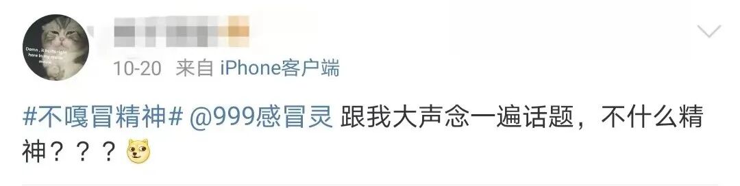 与999感冒灵和蕉内的联名tvc同步上线的,还有一个广告话题词条。999感冒灵从双方联名合作中提炼出「不感冒精神」主题,在宣发时却将「不感冒精神」写成了「不嘎冒精神」,引发吃瓜网友围观。