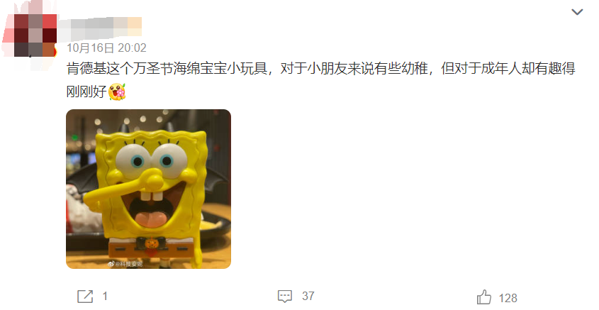 眼看着万圣节就要到了,各家相关的借势活动与物料也都在逐渐释出,最近,食品界玩具大王之一的肯德基也延续了一贯稳定的发挥,发布了四款万圣节主题的小玩具。新玩具仍是延续了2021年万圣节的合作IP:海绵宝宝,对IP中的四个经典角色形象进行了较为符合设定的万圣节式演绎。其中最受欢迎的当然还是动画里不动C位的海绵宝宝了,魔性机械的起伏动作、有节奏的“变脸”、海绵宝宝本身略显呆萌的形象吸引了众多喜欢这部动漫作品的人群,同时产生了大量的搞怪沙雕风格的二次创作。海绵宝宝的这一整套动作,相信大家看了都会有些眼熟。不错,肯德基正是借鉴了自己五个月前可达鸭的爆款经验,用富有节奏感的简单动作吸引用户开创性的玩法,这种互动性极高的玩具也能够成为短视频时代里绝佳的素材,从而催生出大量的UGC内容,产生了全网联动的营销效果。经过社交媒体发酵后的可达鸭玩具话题更是冲到了热搜第一:当然,肯德基的玩具的火热也离不开IP角色本身的魅力,海绵宝宝系列动画本身在中国市场就有庞大的受众人群,是许多人的童年回忆,围绕这部动漫作品的相关二创一直层出不穷,相信在读文章的各位手机里一定也有那么几张海绵宝宝的表情包。