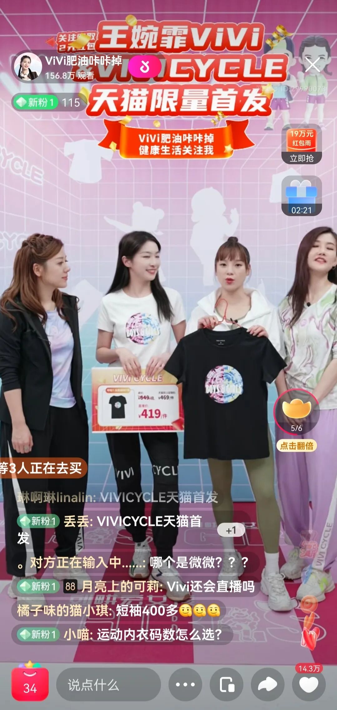 时隔两年回归,情况和以往有所不同。不仅开设了新的直播账号“vivi肥油咔咔掉”,首轮直播带货主角也换成了vivi和旗下主播团“畊练团”,带货品类围绕着健身延展。