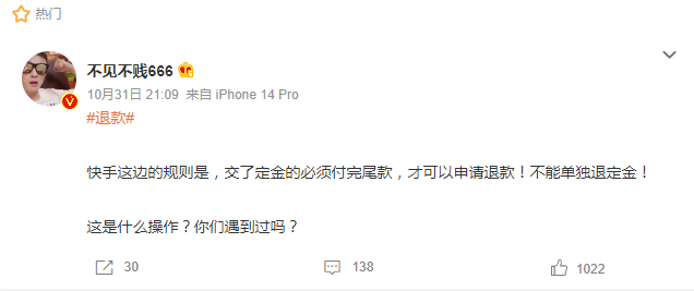 直播电商平台快手的操作更是离谱,有网友表示,快手这边的规则是,要求买家交了定金之后,必须付完尾款,才可以申请退款!不能单独退定金!