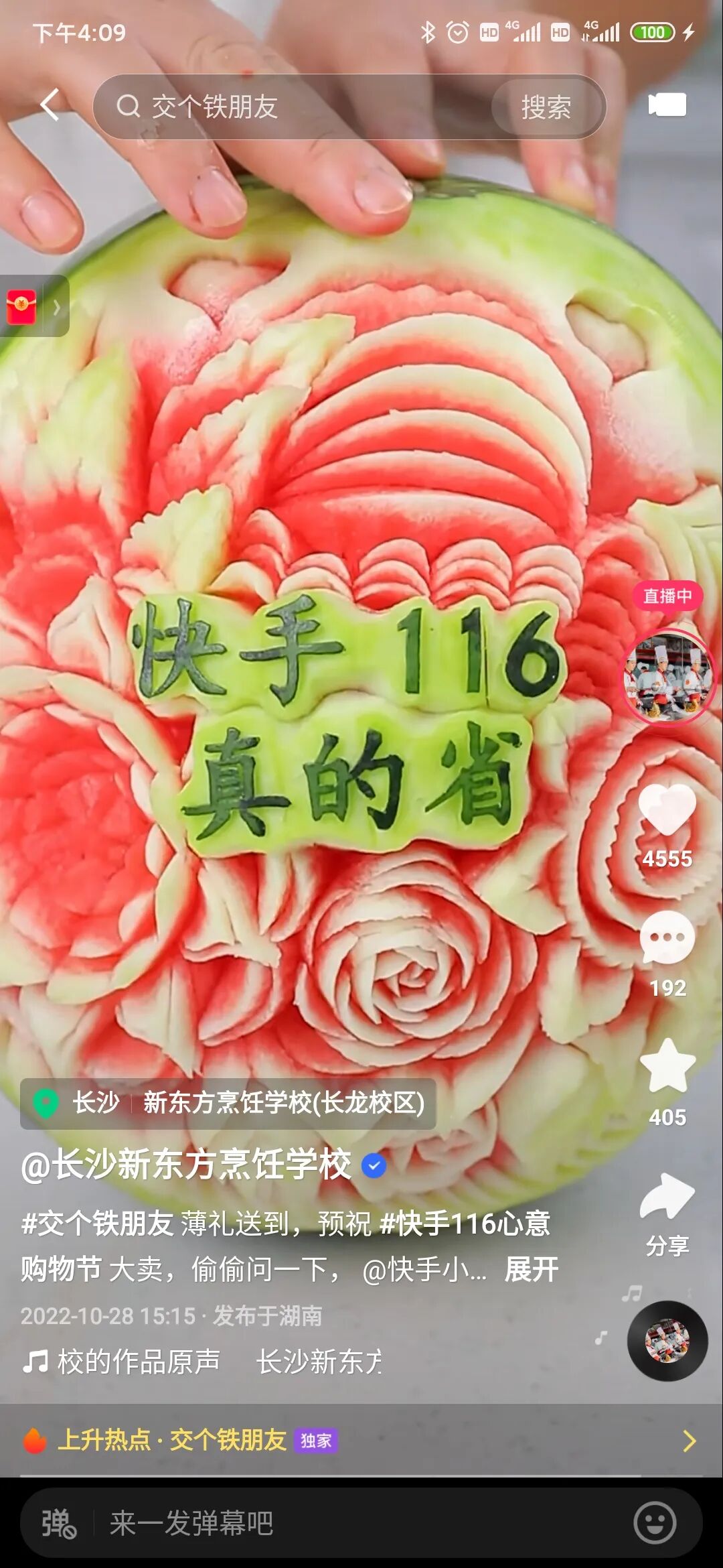 3 情投意合,做“会玩儿”的朋友。朋友之“铁”,“铁”在会玩儿。在快手电商送锅与联合说唱攻占全民视野、吸引注意的同时,11月2日,快手电商还与长沙新东方烹饪学院合体开启了一场兼具场景化、品牌化的直播,完成从心意种草到心意拔草的实效转化。