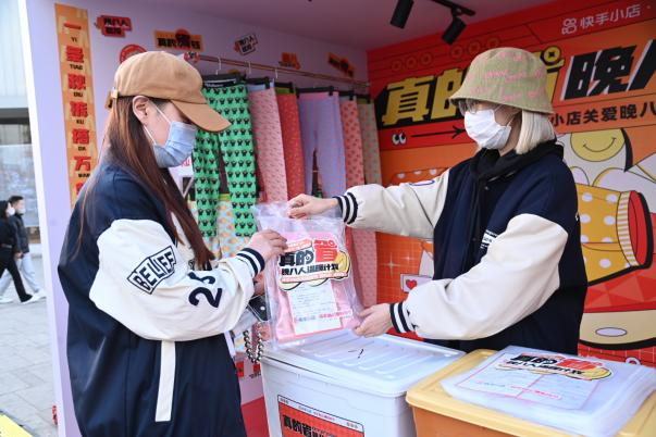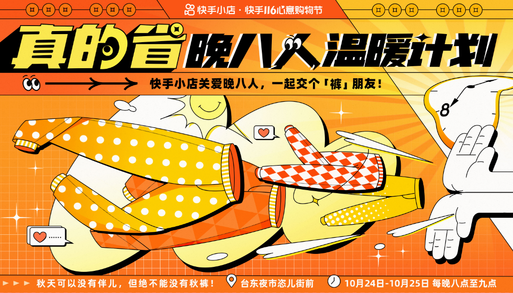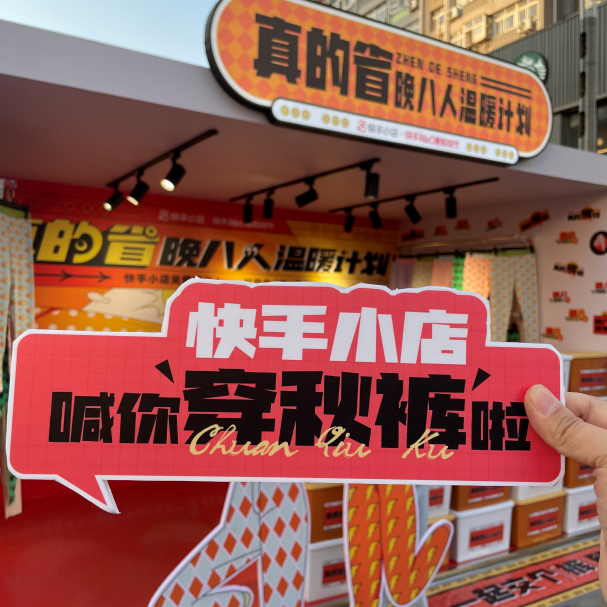 为此,10月24日-10月25日,快手电商在青岛台东恣儿街打造了一场「真的省·晚八人温暖计划」活动,以让人搭配省心、穿着省事儿、又省钱的“秋裤”选品为契机,借着彼时全国降温的阵阵寒意,进入“晚八人”的现实生活情境,为他们送上秋裤,感受来自品牌的一股暖流。活动现场,橘黄色的快闪店在视觉上营造出寒冷深秋里的阵阵暖意,成为晚八人驻足的理由。在为人们的视觉重新打开了一道新命门的同时,也让许多刚下班的年轻人感受到别有一番的温暖意味。暖意十足的打卡装置不仅吸引了许多人相聚来到这里打卡,而且现场送秋裤环节更将关怀具象化呈现。不仅让大众更直观地感受到快手电商为大家带来的实在心意,也让许多人化身“炫裤”达人,在社交媒体自发分享。线下走心温暖之外,线上同样暖意十足。快手电商一方面打造一支social视频《天冷了,爱省的晚八人都在穿》,以戏谑的口吻、网感十足的文案击中晚八打工人、炫饭人、约会人、遛弯人、冲浪人的G点,趣味性突出秋裤在各类晚八人生活中的必要性,强调它百搭单品的地位,潜移默化中透传快手116晚八点有更加重磅的心意补贴的心智。