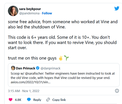 推特前员工萨拉·贝克普尔(Sara Beykpour)发推表示,自己曾参与了Vine的关闭,并说“这些代码是6年前的,有些甚至是10年前的。你不想看那些代码的。如果你想复活Vine,你应该重新开始。”