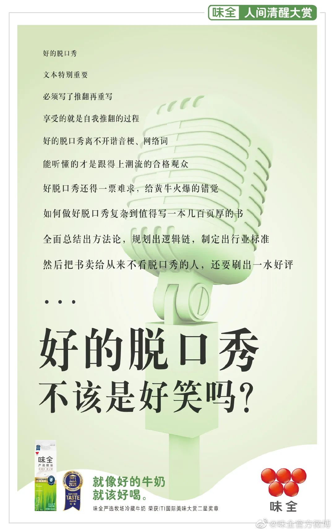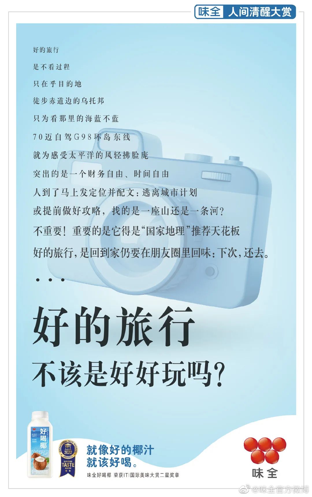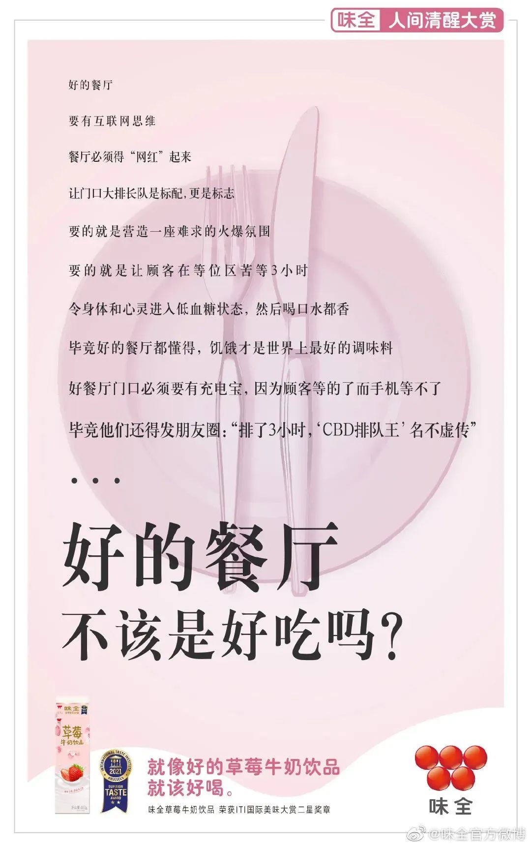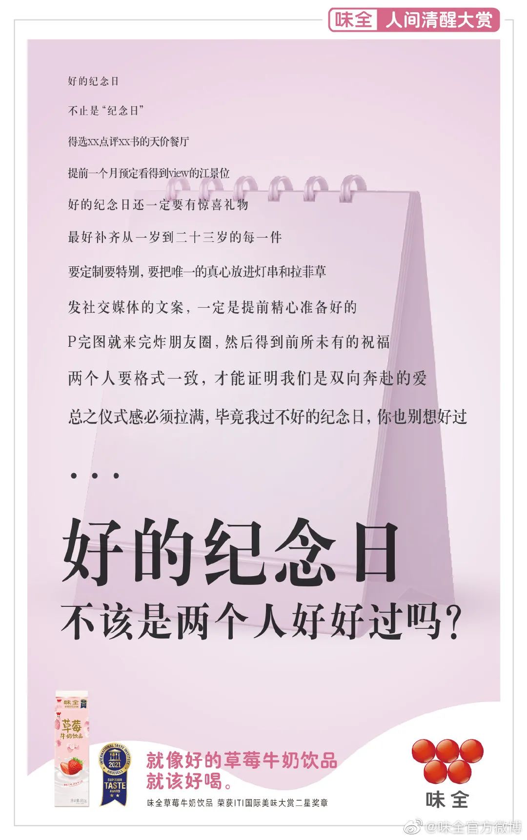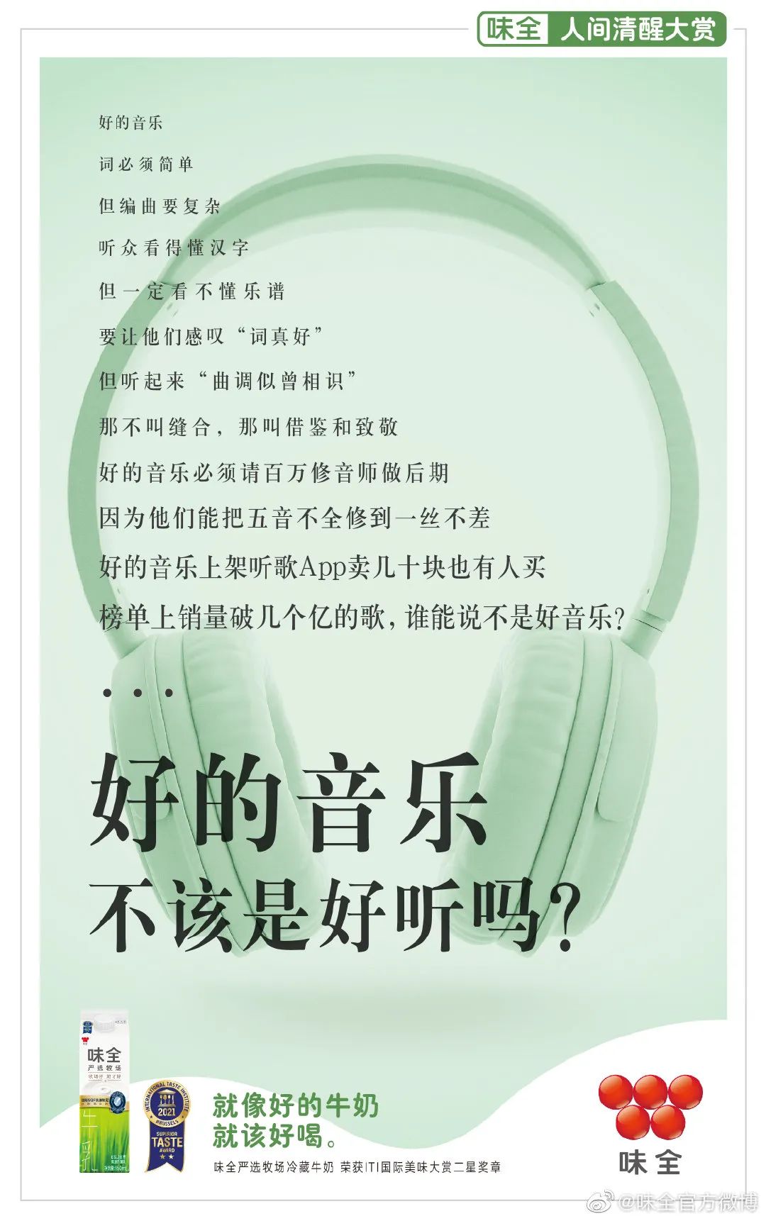 味全以人格化的形象返璞归真,用清醒式的发言抨击“圈内”的乱象,引导大家思考什么是真正的“好”,走进了大多数年轻人的心里,在无形中拉近了品牌与年轻用户之间的距离。那么人间清醒大赏里面说的事,你中了几条?