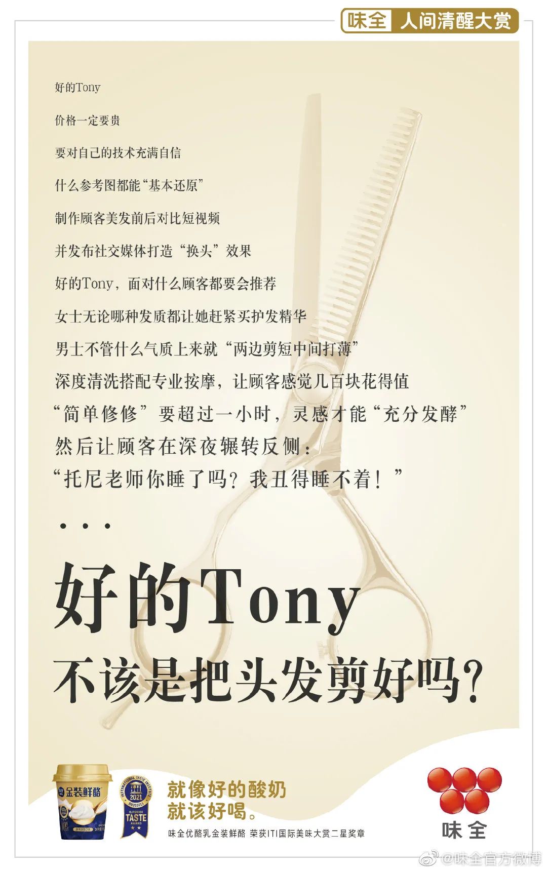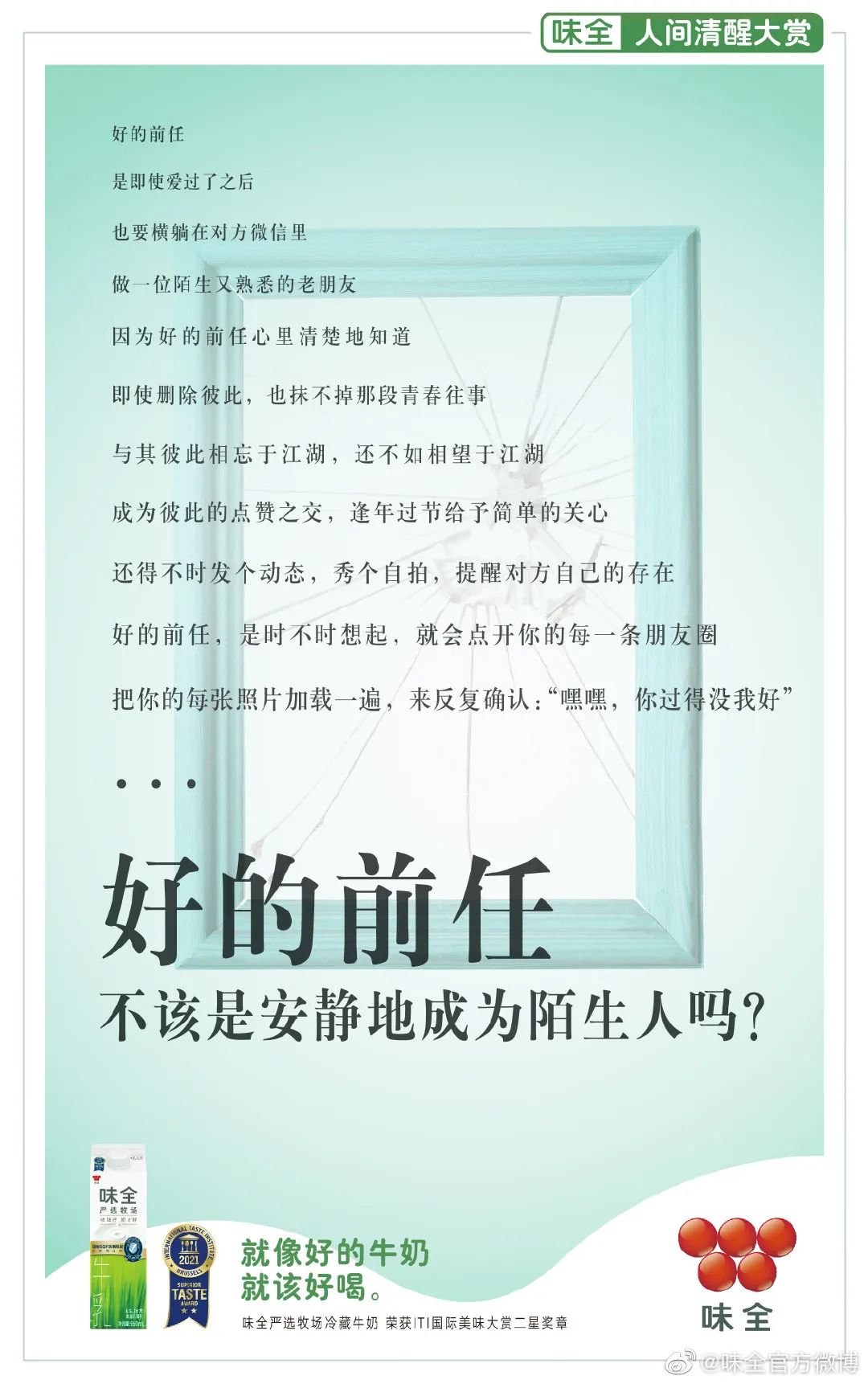 味全开启了一系列嘴炮模式,吐槽了Tony圈、音乐圈、广告圈,把各式各样无法理解的现象都扫射了个遍,并用直给对比的方式向大众传递“味全 = 美味”这一认知印象。一系列人间清醒大赏的文案来袭,甚至前任都难逃一“嘴”!看看这是不是你的互联网嘴替