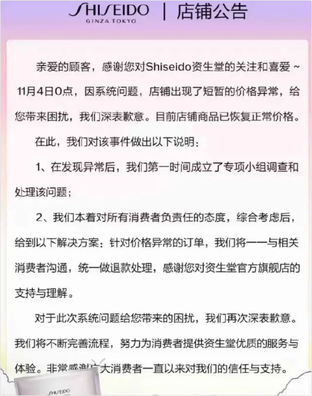 11月4日,淘宝资生堂官方旗舰店发放优惠券,整款悦薇水乳套装只需888元就能得到。资生堂官方说法是系统问题,价格出现短暂异常,并表示会做好退款处理。实际上,花1200元的消费者想要退款或补差价,一个字难。但是有网友能在小红书直接晒出免费的悦薇水乳套装。仅花了888元的“幸运儿”只需退款不退货,不仅能白嫖,还得到许多赠品。资生堂耍了消费者,号称“最低价”的李佳琦在其中扮演什么角色呢?有网友认为,资生堂降价是突发性行为,李佳琦也是被套路了。