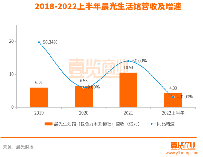 晨光生活馆(包括九木杂物社)在2019年营收6.01亿元,增长率一度达到96.34%。