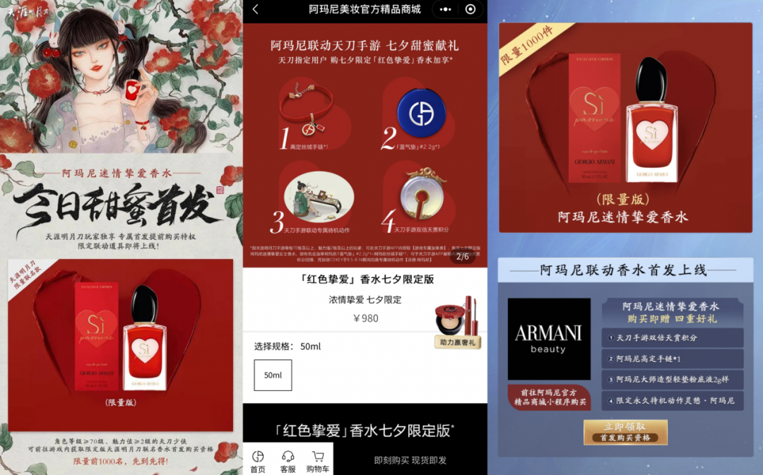 而与游戏跨界,之前阿玛尼和《天涯明月刀》的跨界就很有意思,两个品牌不仅调性一致,甚至在玩法上还进行了深度融合,比如一起携手参加上海的2021ChinaJoy,其次联合推出了——天涯明月刀玩家专属首发购买权的七夕限定香水礼盒,给足了天刀玩家满满的牌面和仪式感。对阿玛尼来说,这次的体验无疑给自己带来了新的消费场景和体验,实现消费者的年轻化。