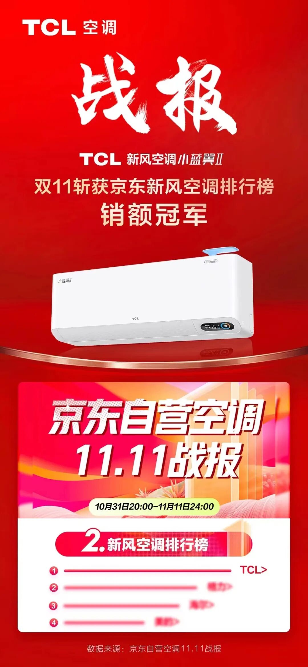 另据TCL公布的“双11”全品类战报显示,TCL新风空调成为电商全渠道销量增速冠军,2匹新风空调挂机成为电商全渠道销售额和销量的双冠军。