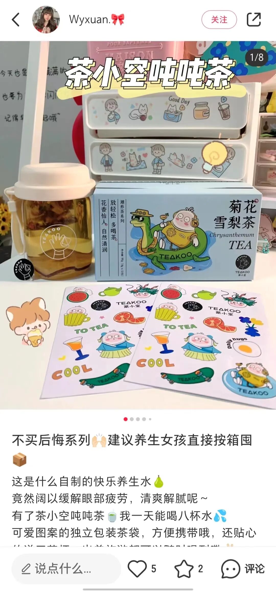 此后,在生活的各路场景中,都能看到茶小空的身影出现。或是初代产品“超萃包”的包装设计、或是微信表情包、或是各路周边等。因此,小空也成为消费者的社交货币,为用户带去快乐的情绪治愈,从而将”茶小空“植入消费者的脑海中。2.扩散:明星、KOC站台,广开通路