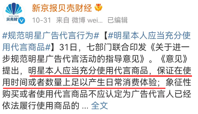 可以看下市场监管总局等七部门最新发布的明星广告代言规定 ,其中就提到,明星本人应当充分使用代言商品,保证一定的使用时间或者数量。
