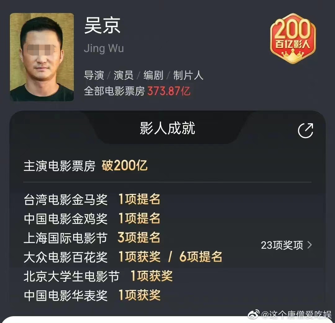 这几年吴京拍了多部主旋律电影,如我们熟悉的《长津湖》《我和我的祖国》《战狼2》等。根据网上流出的百亿影人名单显示,吴京全部电影票房已经突破300亿。