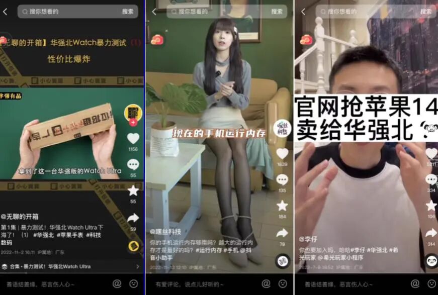 而在这种流量趋势之下,许多头部博主为了流量,也相继出品许多仿货产品评测内容。其带来的结果便是在抖音数码区,博眼球、赚流量成了常态,低价、擦边等更容易获取流量的内容,在此领域始终风行。