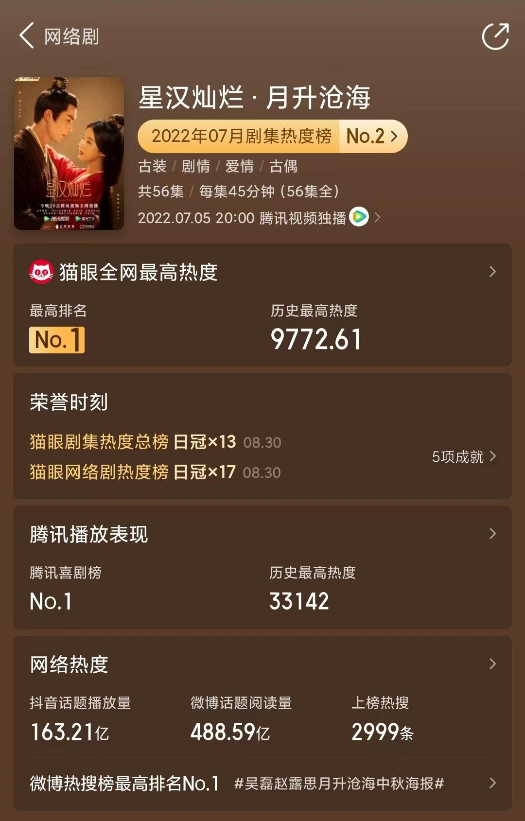 猫眼专业版显示,《星汉灿烂·月升沧海》连续半个月蝉联网络剧热度日冠,开播至今全网上榜热搜话题近3000条。看似剧集板块风光无限,然而用户数据却遁入虚无。