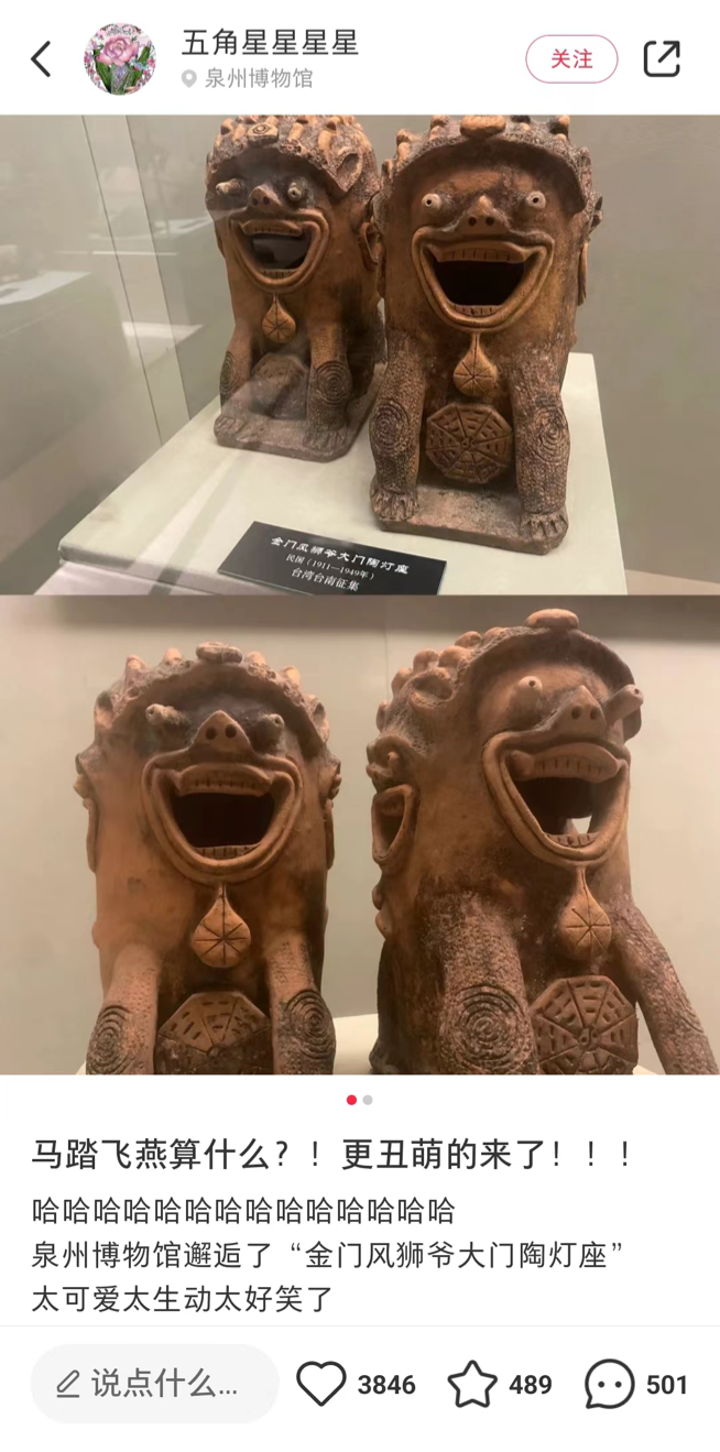 曾经的小萌萌们说丑就丑了,强烈的反差感,深得人心,把自己丑成了活广告。 曾经代表美好愿望和爱情的千纸鹤,两腿一歪就猥琐了,然后就火了。因为这对丑萌的“金门风狮爷大门陶灯座”,泉州博物馆出名了。网友感叹,原来老祖宗好多年前就有这么前卫的审丑趣味了。也许正是感受到了这股来自丑萌势力的强劲,大牌才纷纷出手打造不走寻常路的丑萌出品。至少,有些事不再强求美的时候,会有意想不到的收获。前阵子,据说国内要播拍高颜值韩剧《鬼怪》,网友极力反对找平替。其中一个高赞理由,还是那句话:好看和好笑,总得占一样吧。在小红书,一个平时基本零赞的账号,因为一条沈阳故宫文创木都里龙和甘肃省博物馆马踏飞燕比丑的推文,引来了700多个赞。可见比丑是喜闻乐见,商家坐享其成。对于消费者来说,可爱治愈焦虑,丑萌则可以彰显灵魂的有趣,丑物自有它的治愈效果和社交货币的价值。对于设计师来说,美固然难可贵,但有趣的丑可能更有生命力。