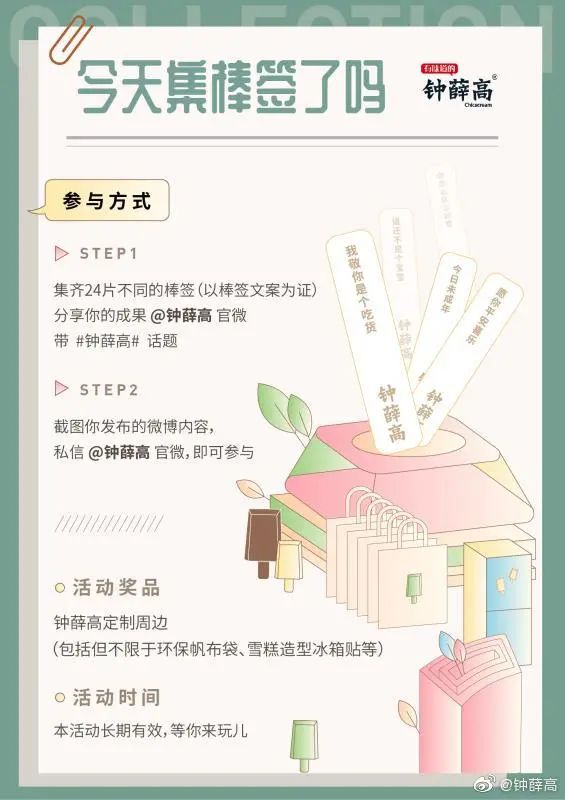 最近,钟薛高也推出了一个收集棒签的互动营销。即集齐24片文案不同的棒签,就可以换取定制周边。