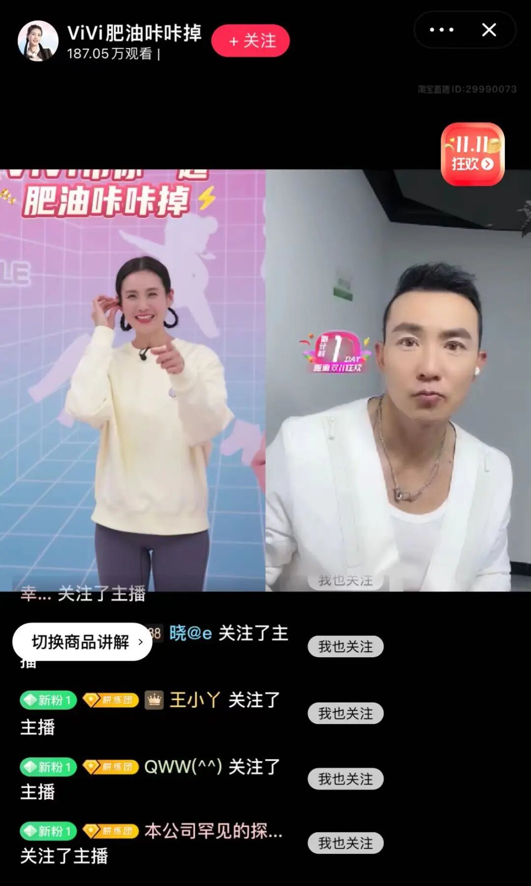 在直播后的半段,不少观众在直播间留言,询问刘畊宏本人是否会来到淘宝直播间,助播则表示,刘畊宏会在9号的直播场次现身。ViVi的带货效果不尽如人意,但网友对于刘畊宏本人的出现充满期待,彼时正值双11期间,网友都期待刘畊宏能够在淘宝直播交出一份满意的答卷。