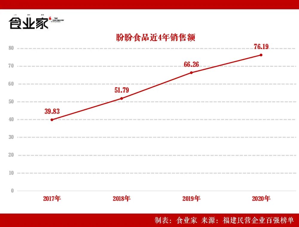 据福建省民营企业制造业排行榜显示,从2017年到2020年,盼盼食品的年营收从39.83亿元,增长到76.19亿元,近四年年复合增长率高达24.13%。