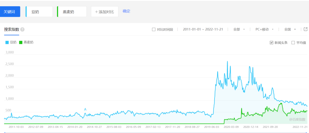 植物奶市场,除了豆奶,也包括燕麦奶等细分类目。百度指数显示,较晚才走进大众视野中的燕麦奶,经过短时间的发展,已明显缩小与豆奶的差距,即将追上后者的市场声量。