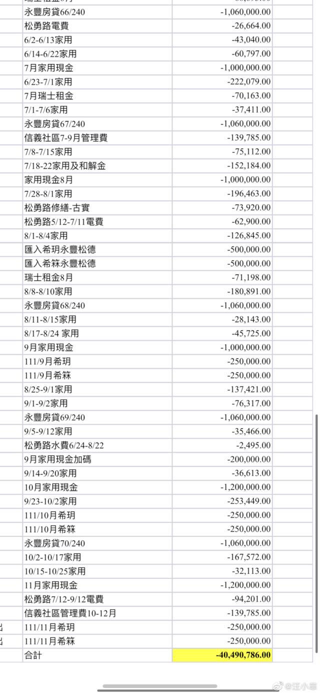 这出戏码的第一集就是电费。汪小菲拉了个小表格曝光开销明细,杂七杂八加起来,汪小菲一年居然要给大S一家4000万台币,合成人民币900多万。上下滑动查看更多