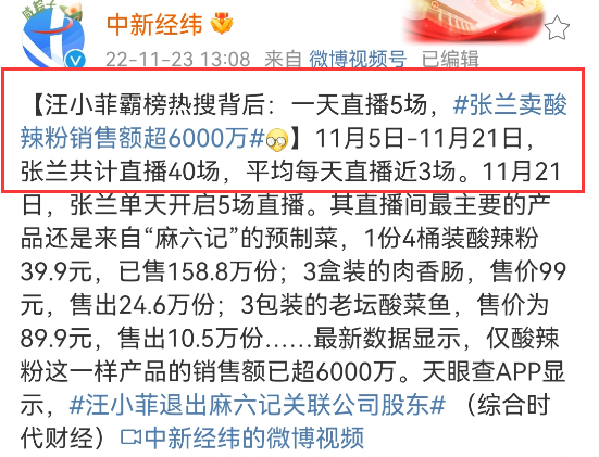 把自己的全身卖得渣都不剩,我寻思着天价床垫是最大赢家了吧。还真不是,汪小菲在微博发疯,汪小菲母亲(俏江南创始人)在隔壁直播间卖疯,主动吃瓜吃在自己身上。据说截至23日上午,张兰直播间销量最高的酸辣粉,销售额破6000万!