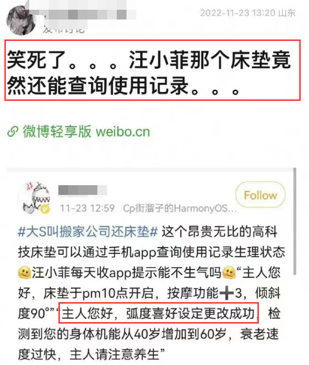 好笑的是网友发现,这床垫有个特异功能——查询使用记录生理状态,比如do的“心率监测”:原谅我忍不住脑补这样的场景:汪小菲半夜睡觉,突然听到手机叮叮提醒“床垫开始启动”,光头在发烧,小菲想把床烧。怪不得汪小菲不纠结房子,偏偏纠结床垫。所以买海丝腾床垫,跟人傻钱多无关,买得“痛心”用得“放心”。整个台北都在机场等小菲,像极了情窦初开的少女等待爱情,怕他不来又怕他乱来。没等来汪小菲,却等来大S找搬家公司搬床的热搜。