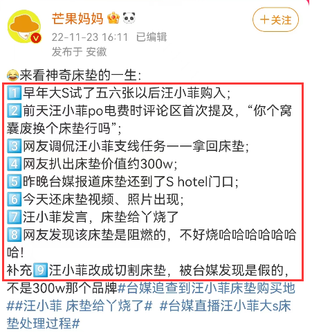 烧不着还剪不掉吗?床垫又被曝送到汪小菲饭店S HOTEL,台媒当场直播千刀万剐发布会。