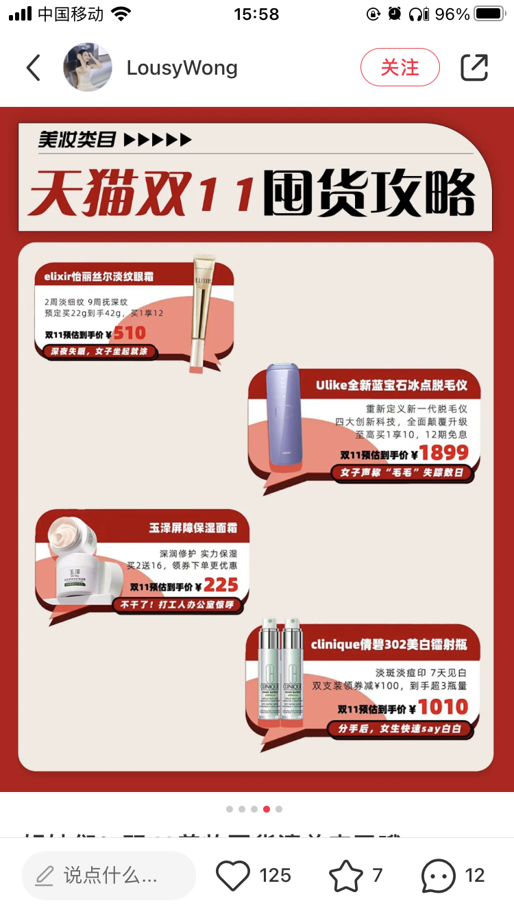 比如,活动话题下的博主@谭荔元plus 解析了双11第一波怎么买,蹲哪天、蹲几点、必领大额券、如何笔笔返,图文表述得十分清晰,用户可以直接“抄作业”;另一位博主@LousyWong 则聚焦美妆类目,晒出了超全的双11美妆囤货清单,像这样的内容分享在#双11拿捏大全 的话题页面里不胜枚举,可见该话题在小红书站内的热度。