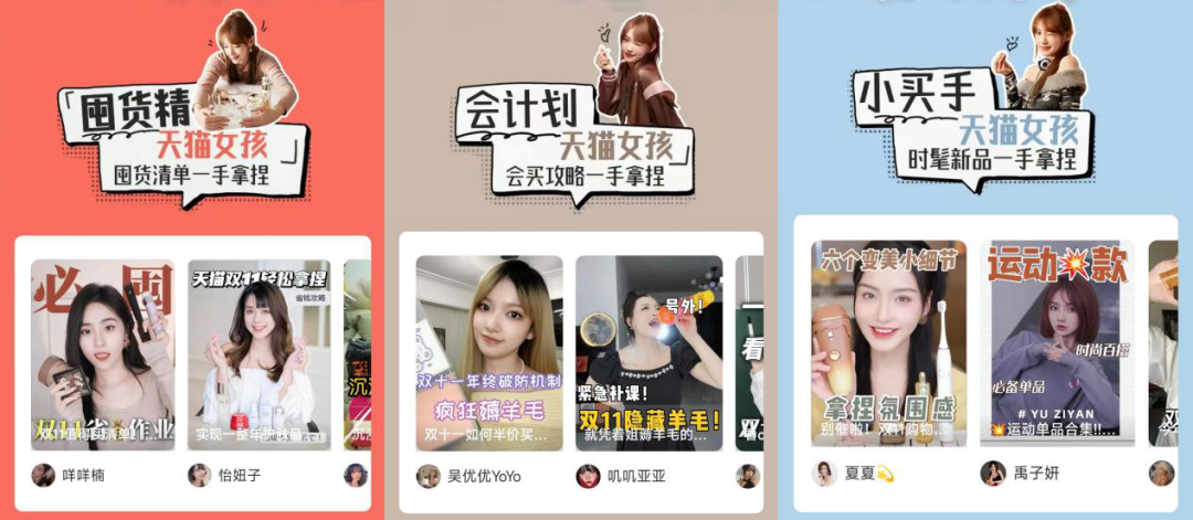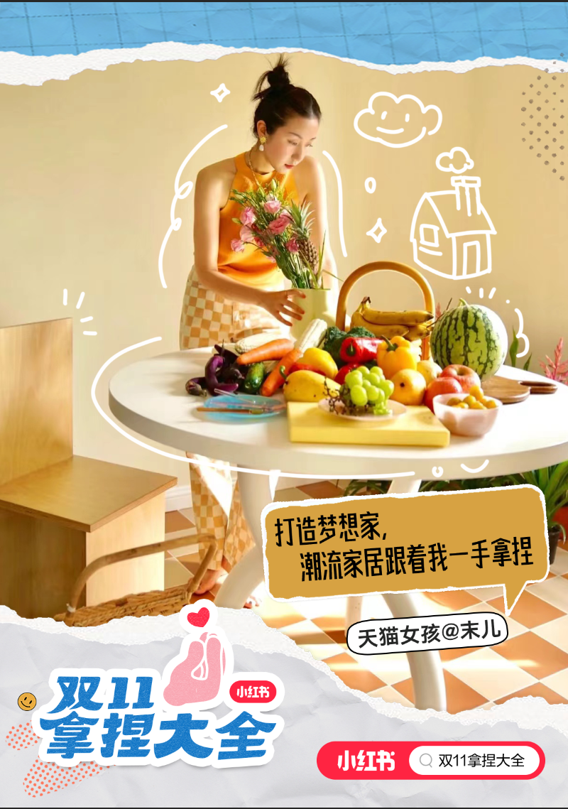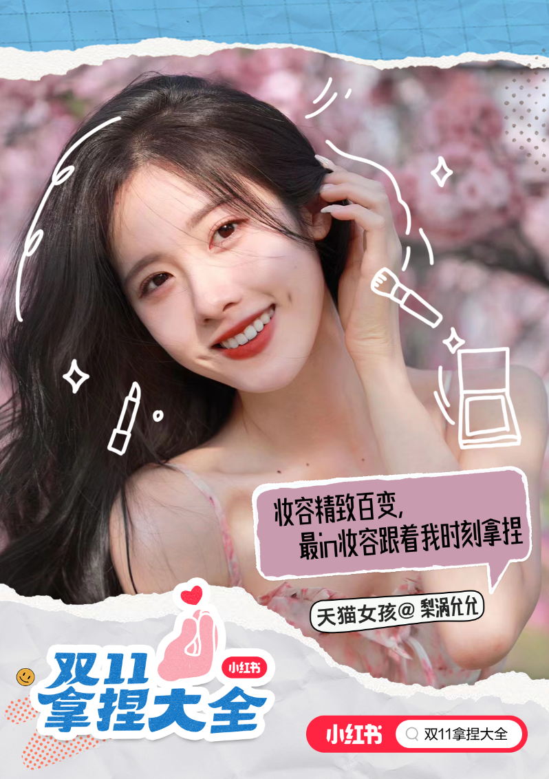 小红书借助明星程潇+头部KOL分类拿捏天猫双11,通过系列海报在全站对天猫女孩身份广而告之,邀请美妆、穿搭、美食、家居、户外、宠物六个赛道的头部KOL成为天猫女孩课代表,交流拿捏经验,形成圈层讨论。