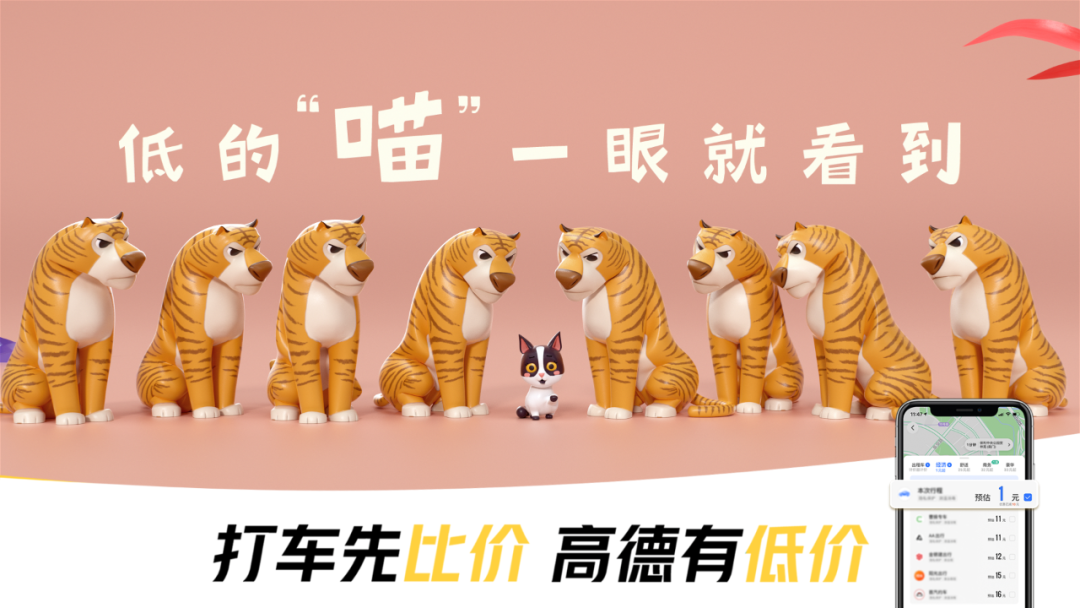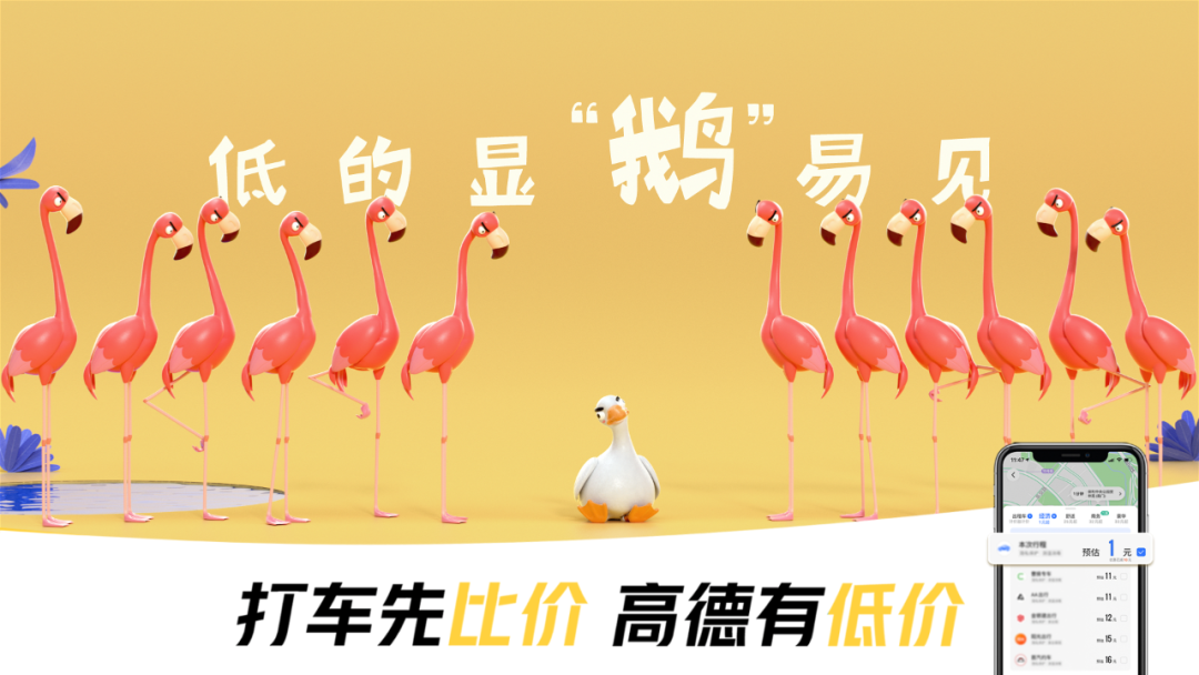 怎样诠释“打车先比价,高德有低价”这个核心主题?高德选择借助动物元素,并运用谐音来展现「低的显而易见」、「低的立马看得到」、「低得瞄一眼就看到」这三个抽象的概念。巧妙的是,高德将动物的特征嫁接关联到产品利益点上,在字眼上面用小动物代替,因此广告创意的主角也是大白鹅、斑马和小猫这群可可爱爱的动物,用接近的两种动物,展现「反差萌」。通过充满童趣的广告画面,再配合奶萌的小女孩画外音,既能让人眼前一亮,又让人过目不忘。广告大师奥格威曾提出的广告表现的“3B”原则,即Beauty— —美女、Beast——动物和Baby——婴儿,该原则成为屡试不爽的黄金法则。可爱的动物和幼儿天生自带吸引力,且更具亲近感,因而更能吸引受众注意。