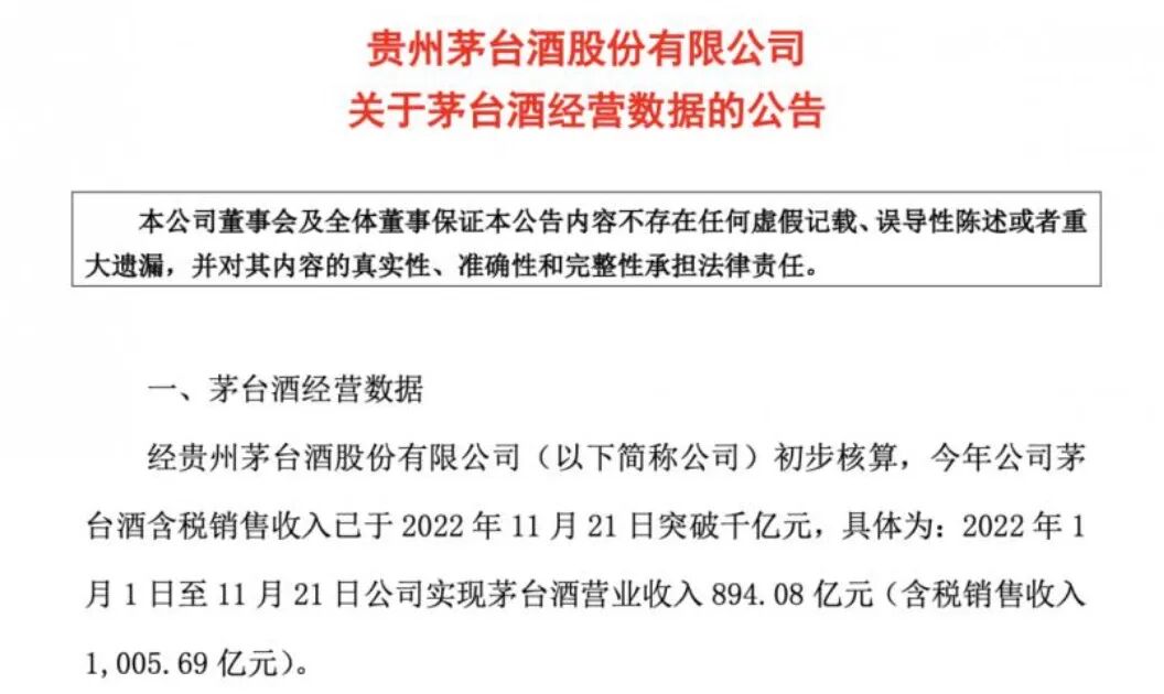 11月22日,贵州茅台发布公告称,经初步核算,今年公司茅台酒含税销售收入已突破千亿元,具体为:2022年1月1日至11月21日实现茅台酒营业收入894.08亿元(含税销售收入1005.69亿元)。