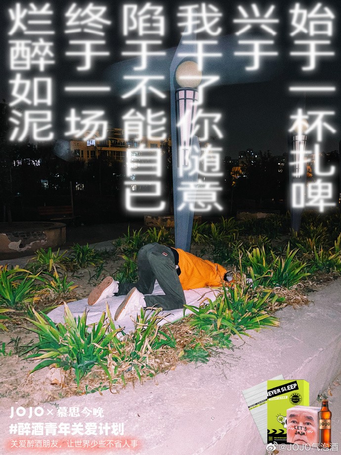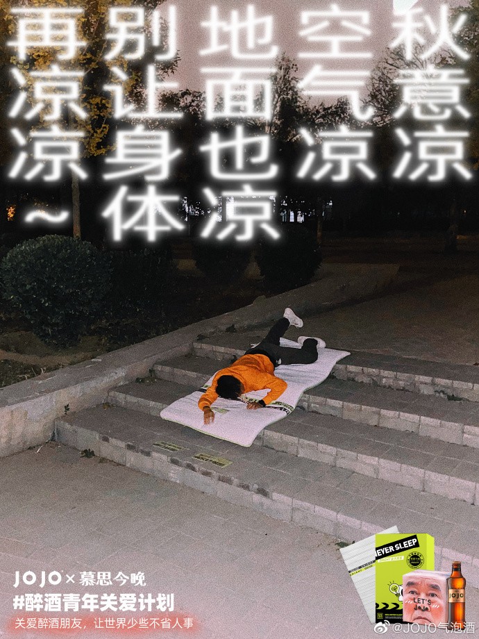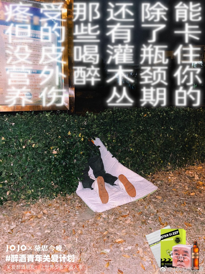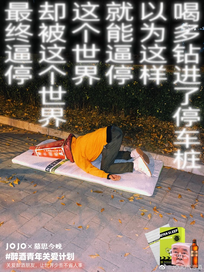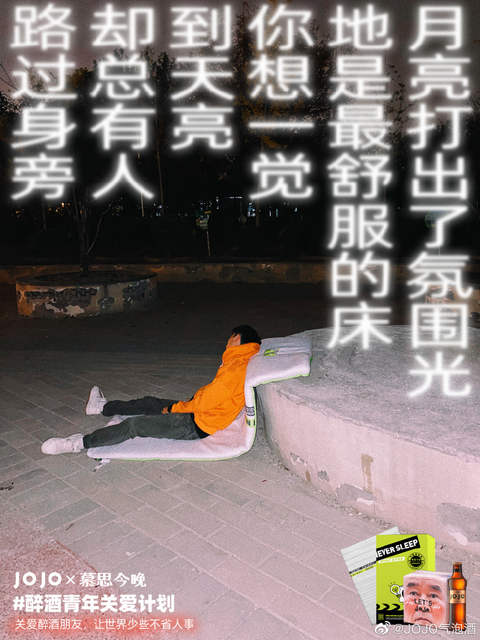 social海报描绘了一副深夜街头醉酒图鉴。喝醉酒的人抱着一张床垫睡倒在大街上,通过展现“丑态百出”醉酒姿态,来传达“关爱计划”——冬天到了,喝的烂醉如泥倒在外面的朋友,来JOJO领个床垫,少一些天寒地冻中的不省人事和不省人事中的直接地气......