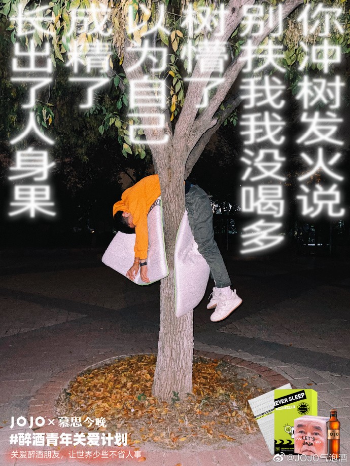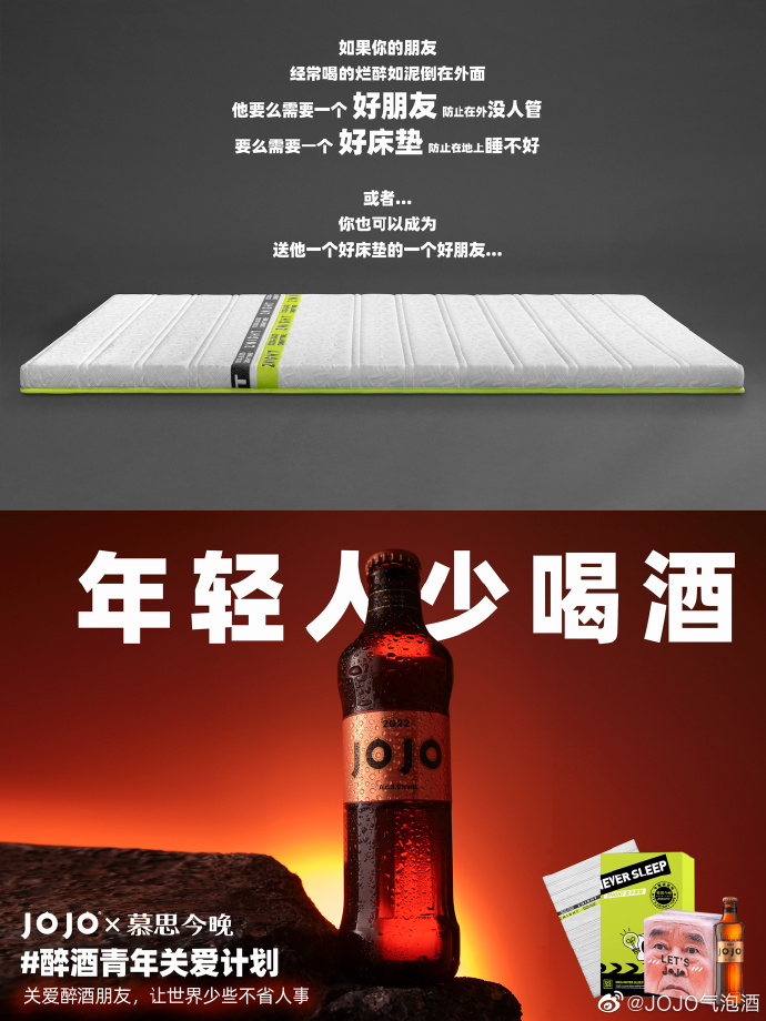 床垫品牌有意思的营销不止海丝腾,最近,慕思今晚和JOJO气泡酒曾有过一波联动营销,推出「醉酒青年关爱计划」,“喝醉酒的人,要么需要一个好朋友,防止在外没人管;要么需要一个好床垫,防止在地上睡不好”这个企划的洞察可谓绝妙,使得JOJO气泡酒和慕思今晚这两个八竿子打不着的品牌联动,好像合理了很多,脑洞满分!