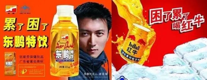 2013年,东鹏请来了谢霆锋代言,在央视等全国性媒体打起了广告。广告语直接抄袭红牛的“困了累了喝红牛”,定为“累了,困了,喝东鹏特饮”。