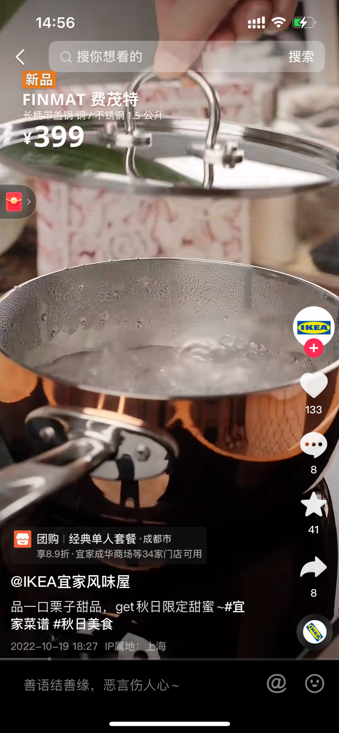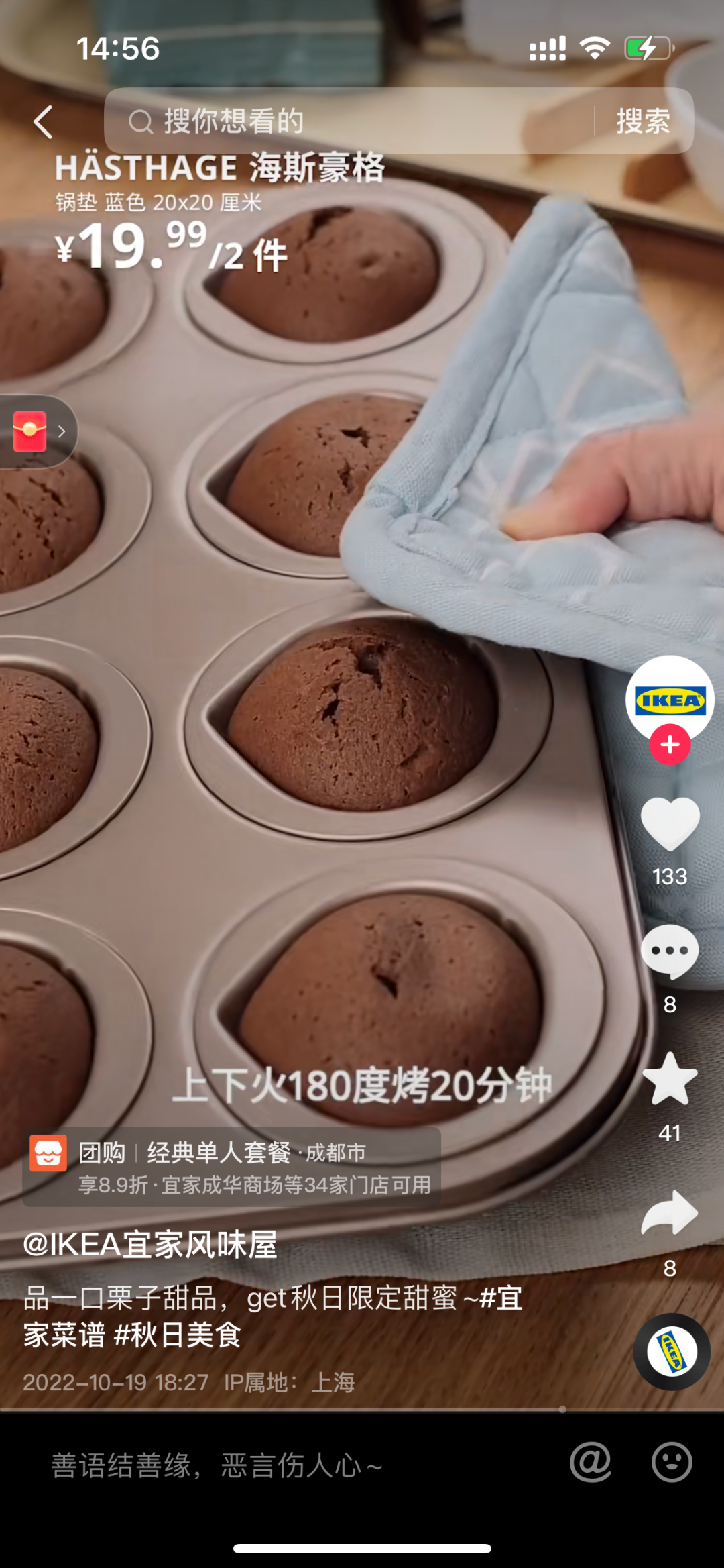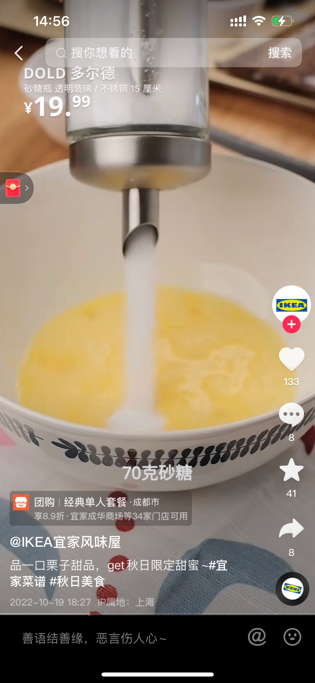 开始卖美食的宜家,在抖音上设立了一个账号名为KEA宜家风味屋,为消费者提供了制作美食的教程,并将宜家产品融入到了内容中,为消费者提供了一个聚焦一日三餐的阵地,同时宜家进行直播卖货,表示正式布局直播电商。