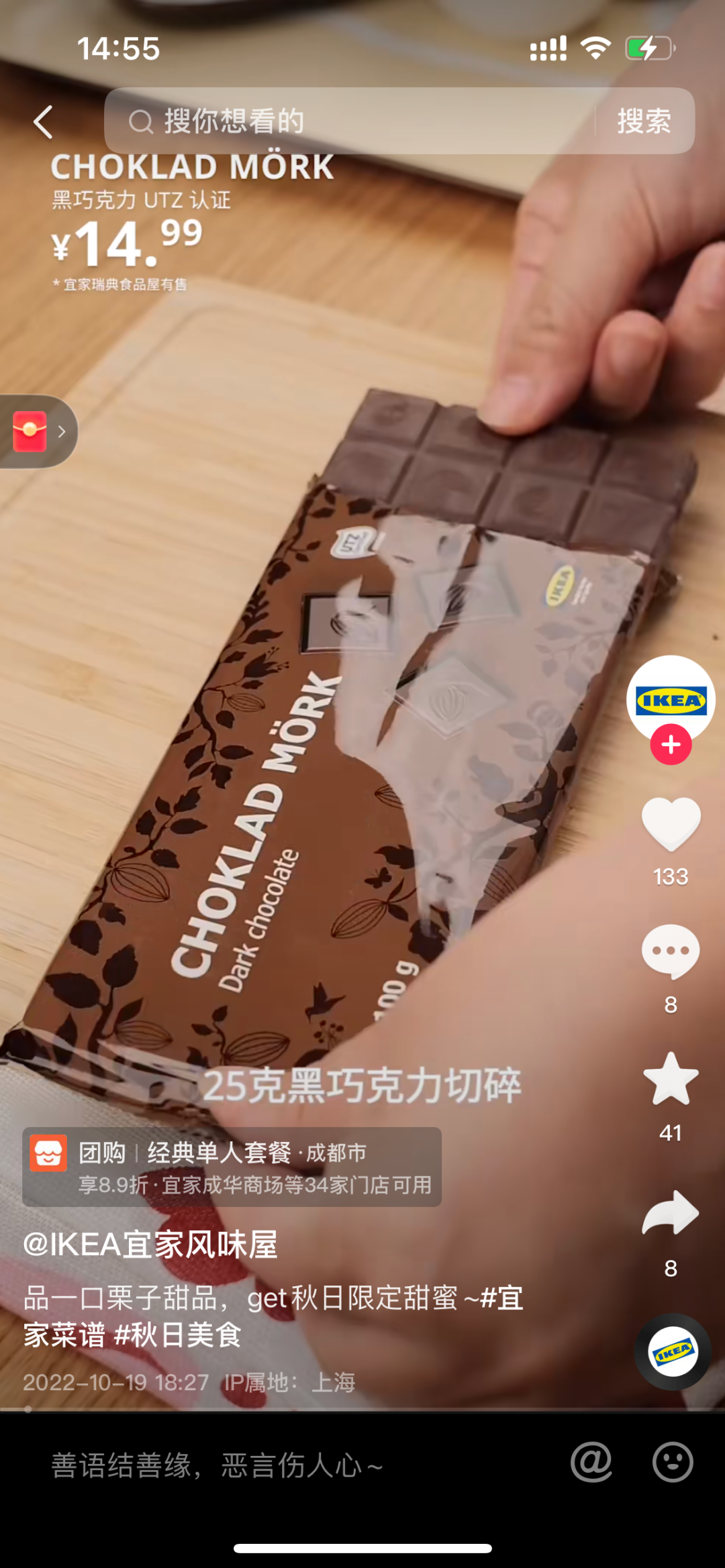 而在一切行为即营销的今天,宜家卖美食的方式本身就是一个噱头,能够给消费者带来新奇感,实用的美食制作技巧,能够助力品牌有效的留存用户,加上宜家产品在内容中有效的露出,提升了产品的曝光度,为转化做好了铺垫。与此同时,宜家还可以将抖音平台作为品牌孵化用户的新阵地,加上品牌直播与内容的粘度,为品牌笼络更精准的用户人群。