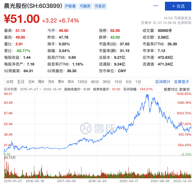 2021年2月,晨光文具股价达到100.27元的历史高点,市值超过千亿,距其上市之初的72亿元市值,6年时间增长15倍,因而被称为“文具茅”。