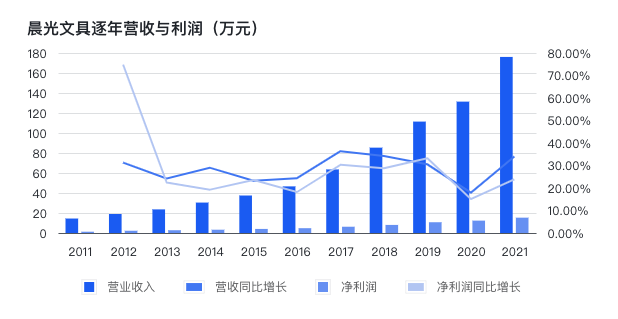 晨光文具财报数据早已显示出传统核心业务的乏力。传统核心业务指书写工具、学生文具、办公文具及其他产品等的设计、研发、制造和销售,2019年到2021年,该部分业务增长率分别为20%,9%、17%。