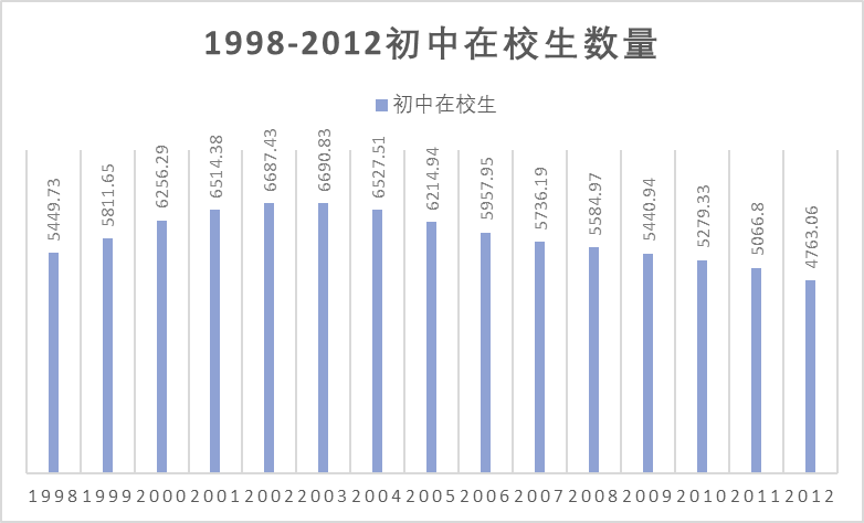 虽然中国出生人口在1987年之后逐年减少,但由于九年义务教育的普及,初中在校生数量的增长一直延续到2003年,并且2012年之前,一直在5000万以上。