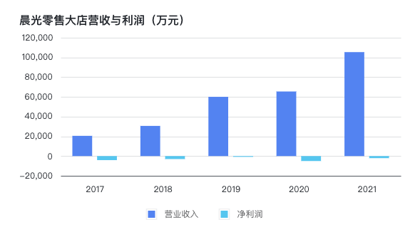 但零售大店对晨光的收入贡献非常有限,而且仍处于亏损状态。2021年,晨光生活馆及九木杂物社实现营业收入10.5 亿元,同比增长 60%,占总营收中的占比仅5.99%,净亏损2108.65万元。
