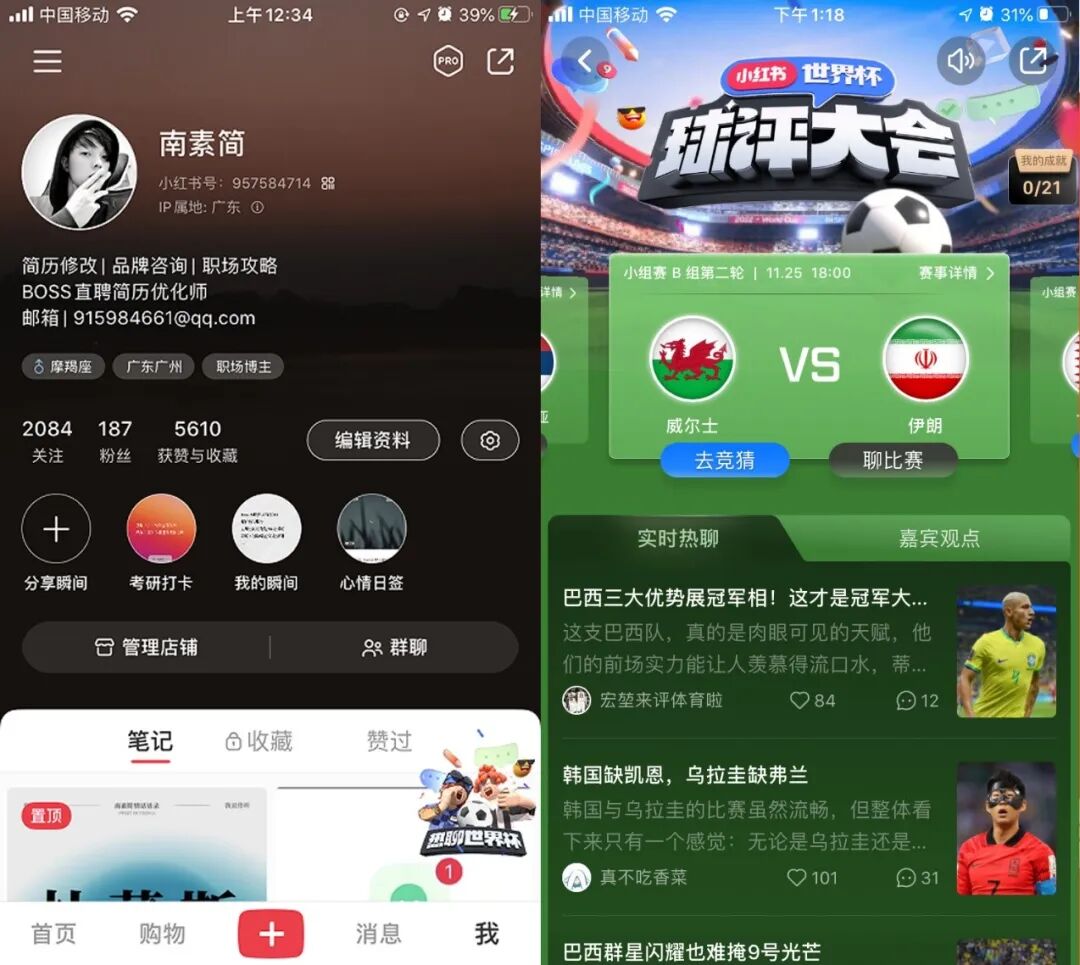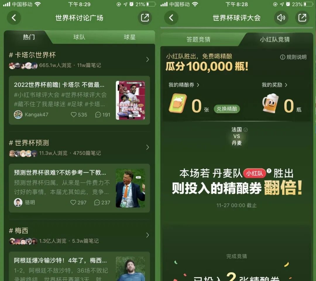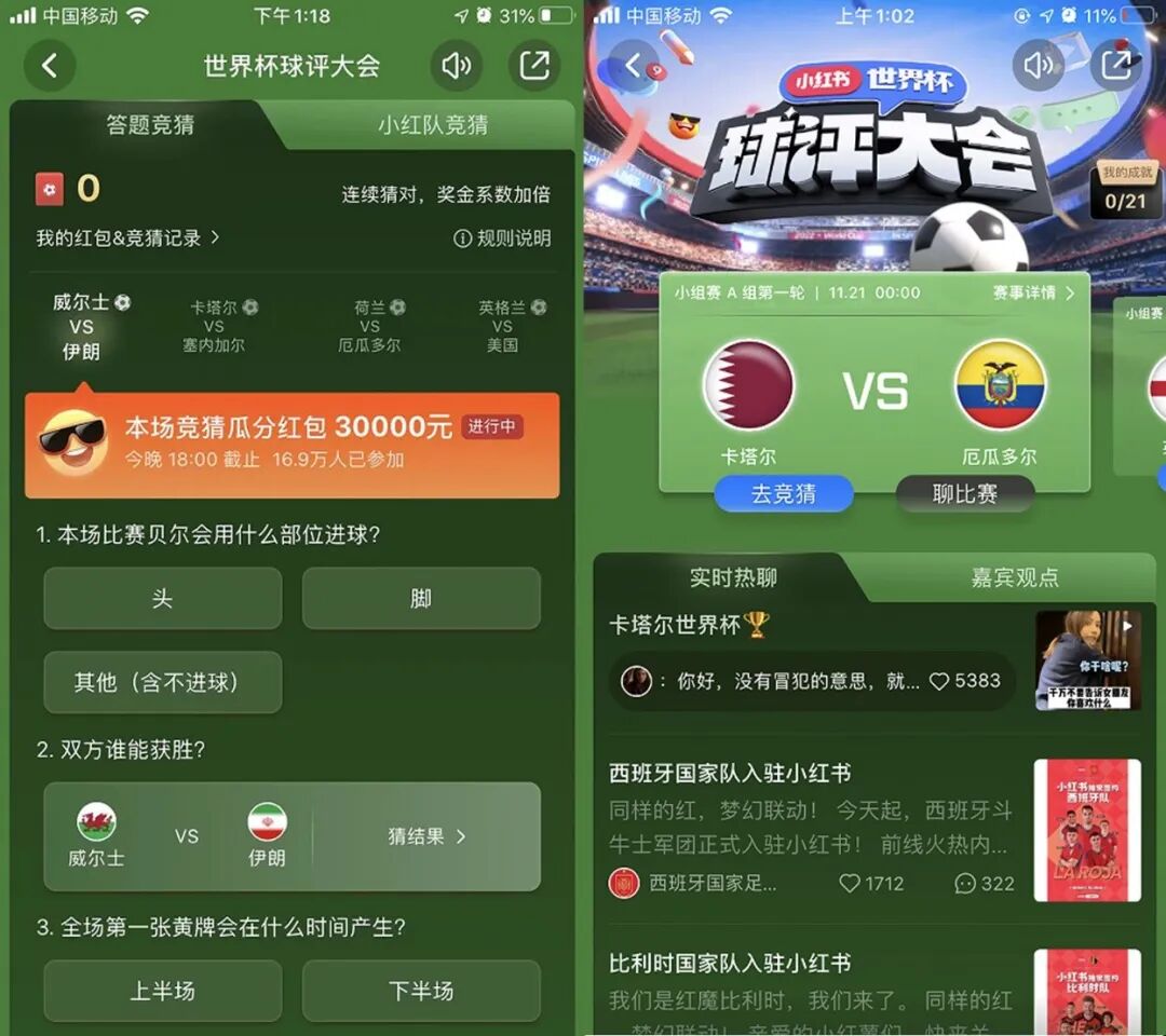 相比抖音平台,小红书的世界杯球评大会活动并不多,但其重要注重用户的参与感及社交互动上,通过世界杯讨论广场、实时热聊、竞猜互动等增加用户的活动参与感。