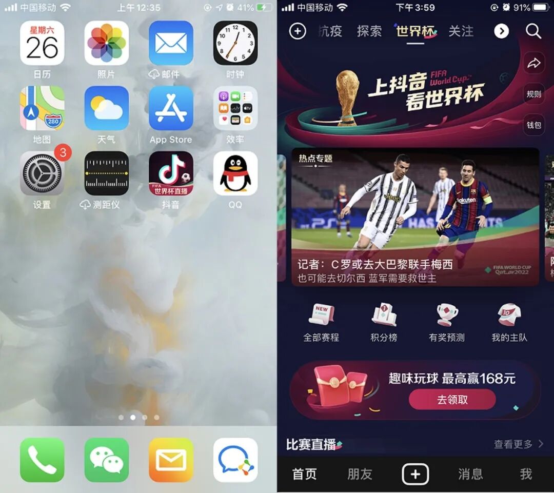 而社交平台,抖音、小红书则围绕世界杯的场景做内容,抖音将整个世界杯“搬”在平台上,用户在手机上打开手机就可以观看到关于世界杯的所有赛事、背后花絮、球队风采等等。