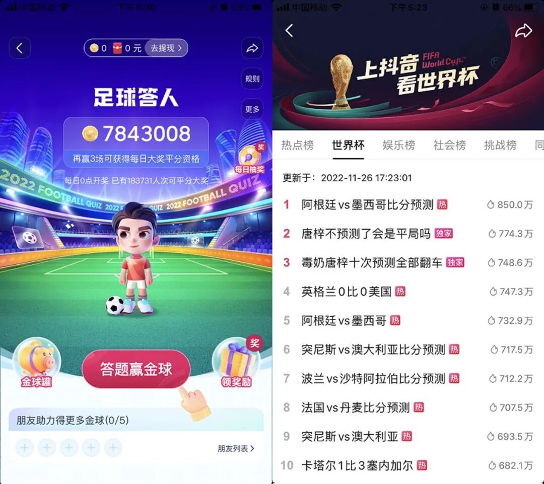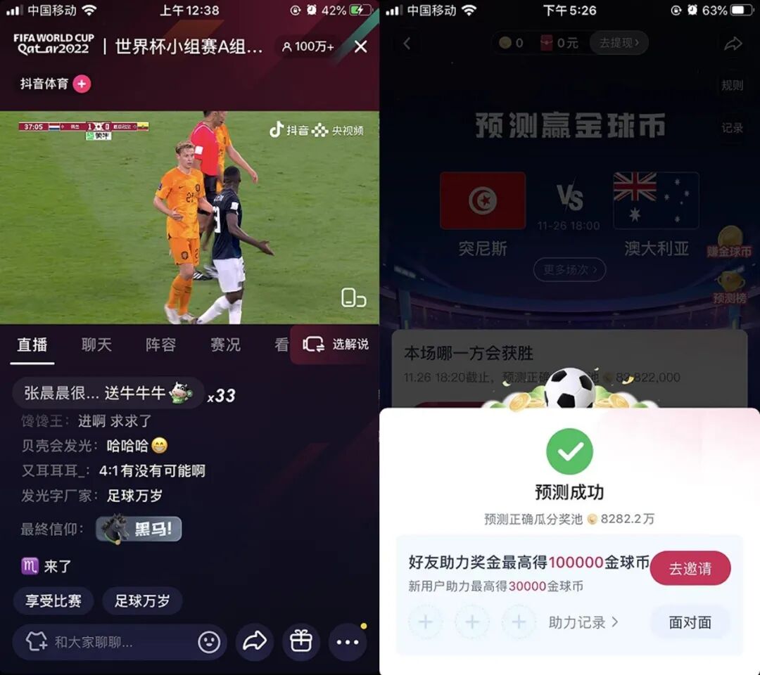 抖音与外卖平台相比,它没有对应的商品让用户购买,但它作为卡塔尔世界杯中3家授权媒体合作唯一的短视频平台,它可以将世界杯的直接放在首页专栏上,且在活动内容上更为丰富,并设置系列活动,营造让用户“看球也能获得收益”的心愿诉求。