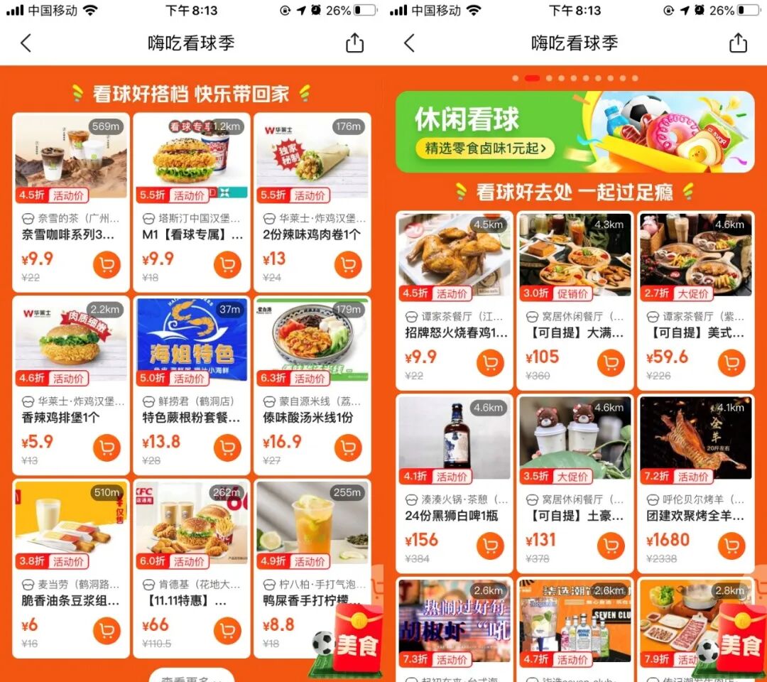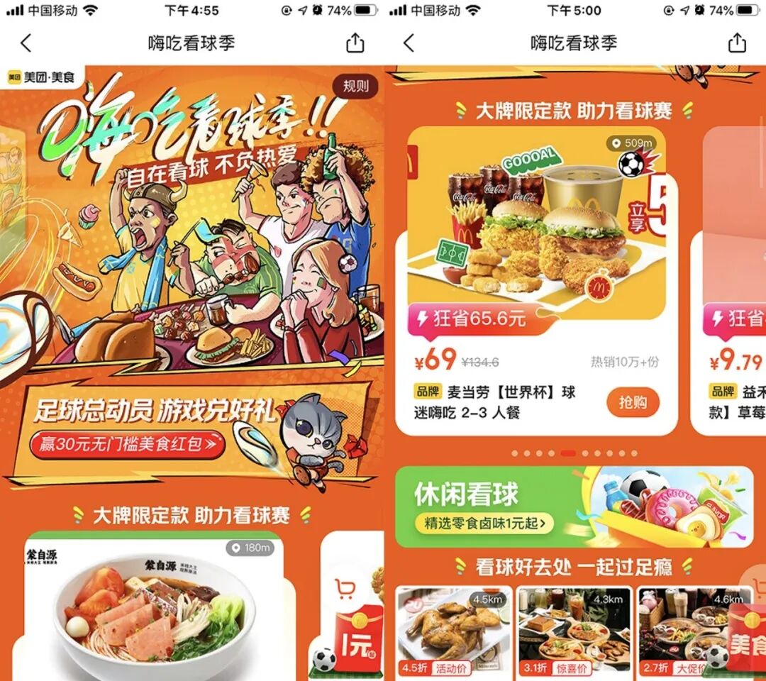 和饿了么相比,美团的《嗨吃看球季》相对比较简单,没有针对活动赛事推出的优惠活动,仅针对看球时候的场景美食需求来推出系列套餐。
