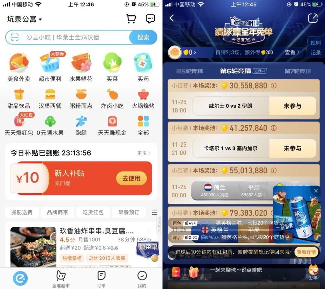 饿了么在平台首页上做的与世界杯相关的入口浮窗是《猜球赢免单》,从字面意思我们可以得出,其主要营销策略就是通过竞猜世界杯的进球,获得免单。
