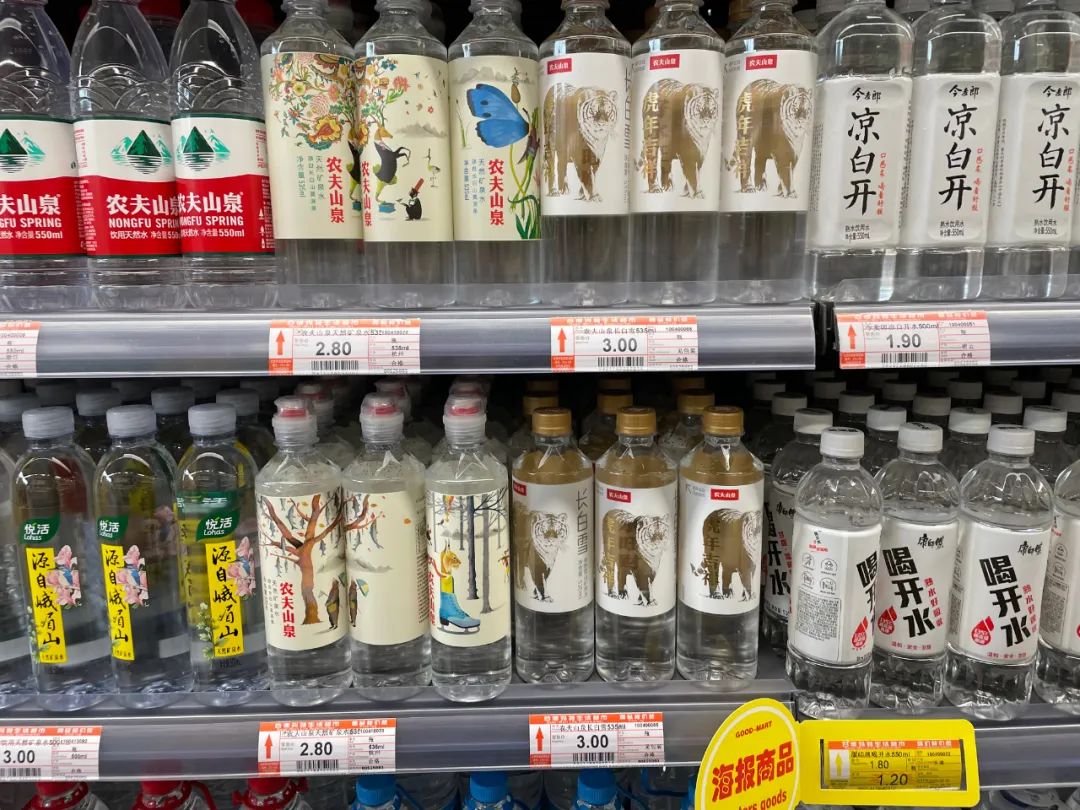 仅仅是一个普通的中型超市,矿泉水货架的品牌就有近40个。面对不同的消费者,有着不同的定位。如农夫山泉针对婴幼儿的饮用天然水,主打无菌,适合调制婴幼儿食品或婴幼儿直接饮用;如农夫山泉玻璃瓶高端水,主打精致小资的白领及高端人士,让喝水变得有格调;如农夫山泉的武夷山泉水,主打泡茶人群,卖点为泡茶专用;再如今麦郎的凉白开,主打中国人都喜欢的凉白开,煮开的水更放心。