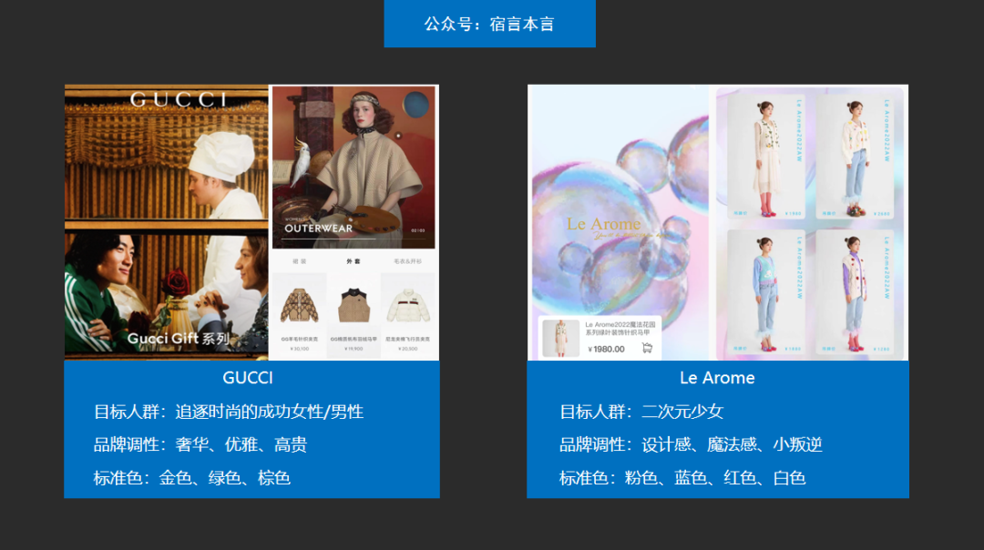 不同的品牌针对某一个人群需求,创造了产品,与其他的品牌形成了明显的差异化。这就是品牌的第一步,定位。就如谈恋爱,你得先知道自己喜欢什么女孩才行,不然见一个爱一个,不得把脸都被打歪嘛...品牌识别简单来说就是品牌的视觉识别系统(Visual Identity)简称VI,VI就像是一个品牌的长相和穿着打扮。当品牌定位了目标市场及目标人群之后,就需要针对你的市场及人群,设计出他们喜欢的产品。这时候,VI就变得至关重要。我们拿服装来举例,GUCCI定位为奢侈品牌,目标受众是具有社会地位、追求时尚的成功女性。而Le Arome定位为设计师品牌,目标受众是追求个性的二次元少女。两个品牌的目标受众不同,所以在视觉识别系统上存在明显的差异。