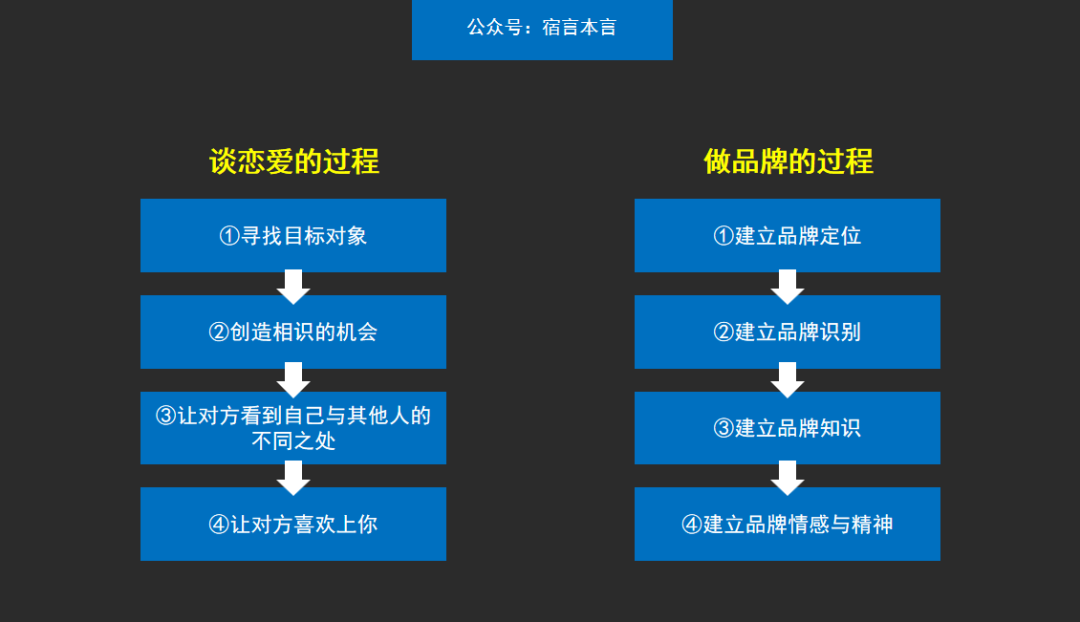 再拿谈恋爱打个比方,当你知道自己喜欢什么女孩,也把自己打造成了女孩喜欢的外表,同时你也多次与女孩接触,成功让女孩认识到了你。那么下一步,你就需要让女孩看到你的内在了,比如你超级正的三观、努力不放弃的精神、不屈不挠的性格以及心地善良的内心。那么恭喜你,牵手成功。很多人觉得,在社交媒体上找一堆博主,然后推广你的产品,就是做品牌。也有不少人认为在电梯上或机场里发布几个广告就是做品牌。这多少有点片面了。做品牌就和谈恋爱一样。你不知道自己喜欢什么,怎么谈恋爱?你不去把自己包装成对方喜欢的样子,对方凭什么喜欢你?你不去想办法接触对方,对方怎么认识你?你只有外表没有内核,对方凭啥爱上你呢???