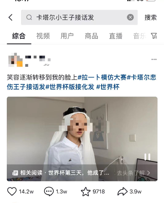 世界杯开赛第一天,#卡塔尔悲伤王子接化发 登上抖音热榜首位,围绕此话题结合DJ神曲+搞笑模仿秀的二创更是为这一话题带来 3000万+的播放量。